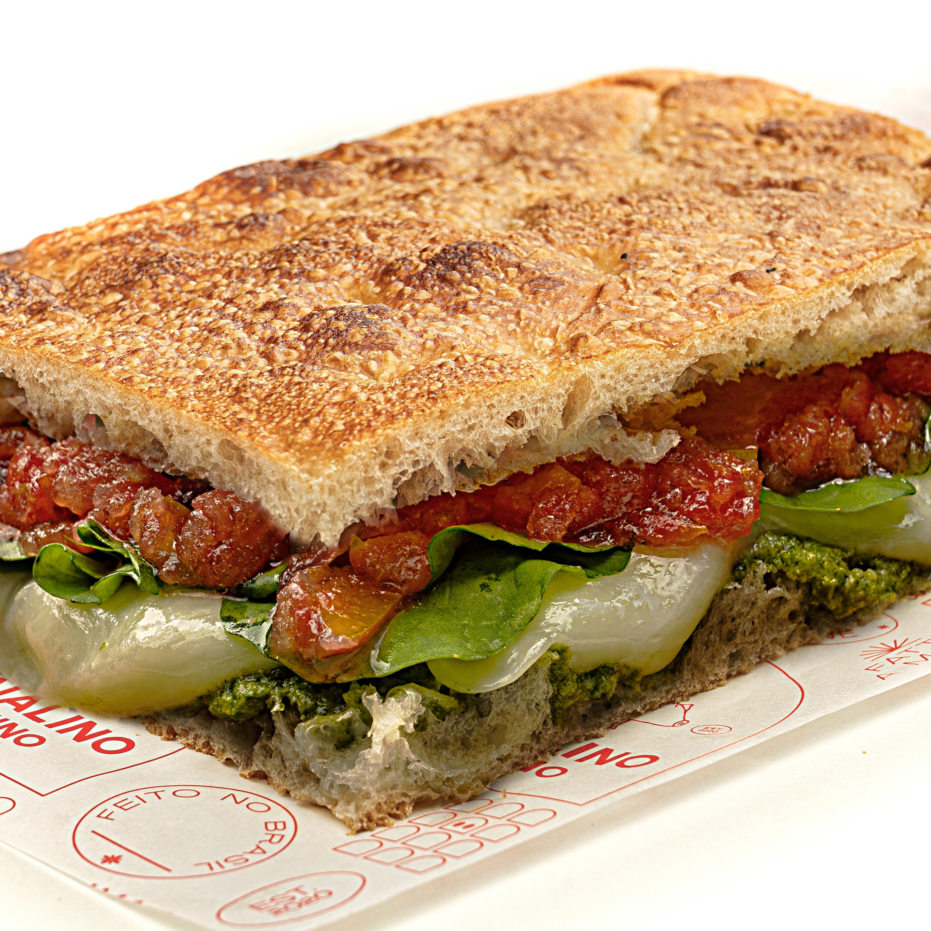 Nosso pão, pasta de tomate, rúcula, pesto da casa e uma generosa porção de queijo minas padrão de búfala em fatias. Recomendamos que seja aquecido, mas em temperatura ambiente também fica uma delícia. Acompanha mix de chips (batata doce e batata asterix). Panino de aprox. 280g. *Não alteramos receitas prontas